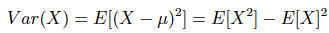 분산이 기대값 수식 모양으로 표현이 되었죠? 자세한 증명과정이 궁금하시다면 여기에 정리가 잘 되어 있습니다.