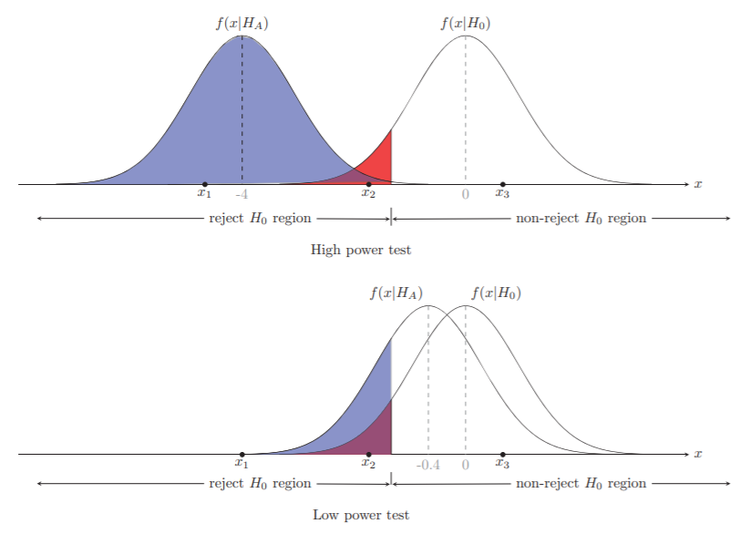 $ f(x|H_0) $ 그래프에 빨간색으로 칠해진 부분은 유의 수준입니다. 마찬가지로 $ f(x|H_a) $에 보라색으로 칠해진 부분은 검정력입니다.