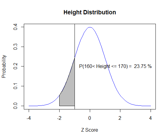 위와 같이 남성의 키가 정규분포를 따른다고 가정해봅시다. 이때 아무 남자를 가리키고 그 남자의 키가 160cm과 170cm 사이일 확률은 23.75%죠. 160cm와 170cm의 경계선을 그었을 때 회색 부분이 곡선 하면 적인데 이것이 그 구간의 확률입니다.